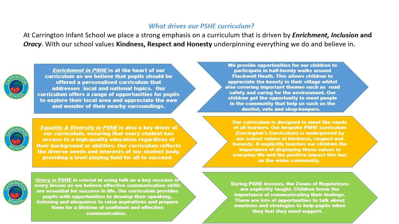 Our bespoke PSHE Curriculum is named Carrington's Curriculum. It is underpinned by our three core values of kindness, respect and honesty and it has the celebration of the differences we have in our wonderful school at its core. In addition to the statutory curriculum objectives, it includes topics that, through pupil and parental voice, we know that our community want to learn about such as: first aid, animal safety and learning Makaton. Our sparkling PSHE offer also includes half-termly walks around our village to recognise and appreciate the awe and wonder here in Flackwell Heath. We have a dedicated Carrington's Curriculum Class Dojo page where all lessons are recorded in a variety of ways such as videos, photographs, voice recordings or songs.