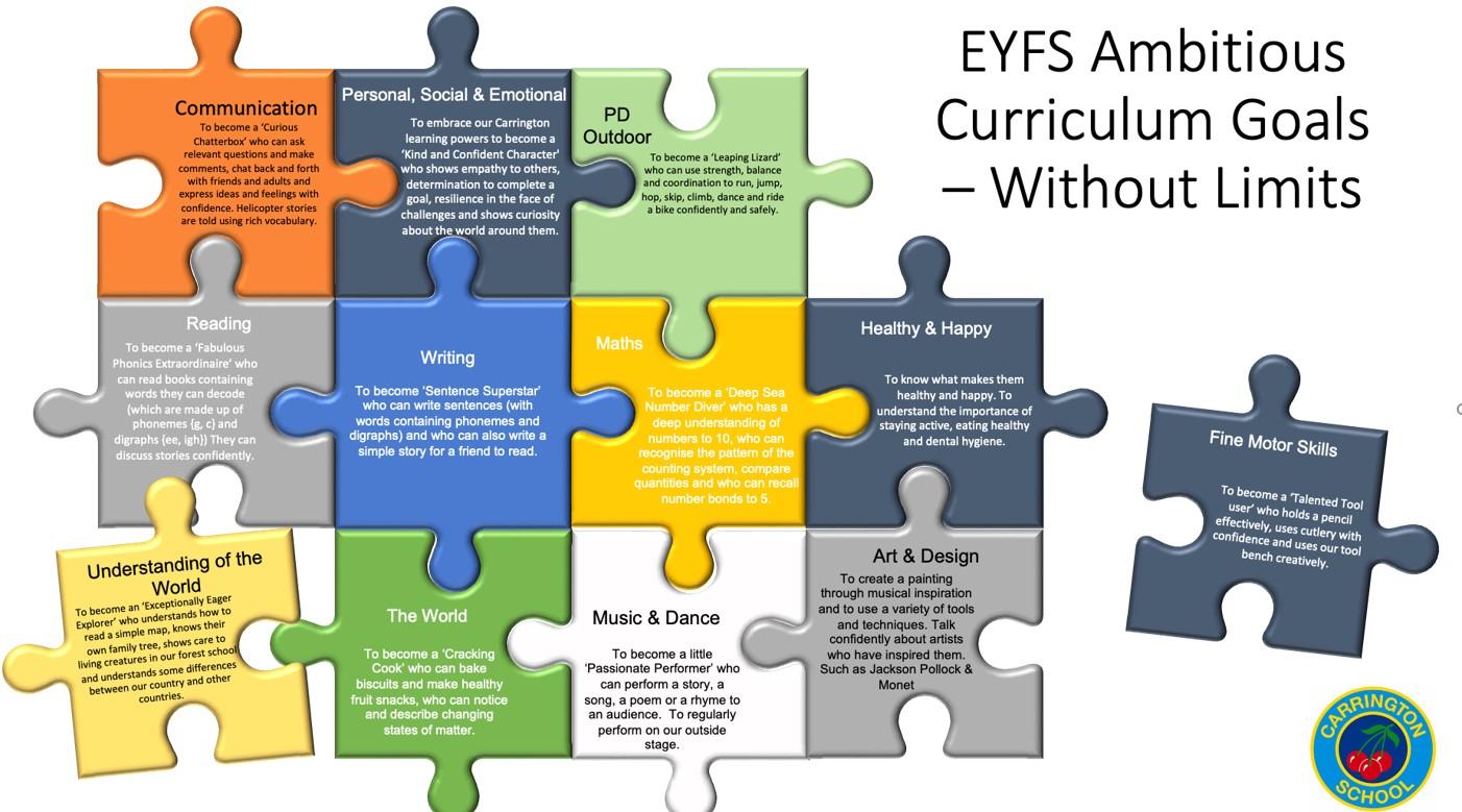 At Carrington Infant School we meet the welfare requirements laid down in the Statutory Framework for the Early Years Foundation Stage and actively safeguard and promote the welfare of all of our children. We prioritise creating a ‘language rich’ environment through the use of songs, nursery rhymes, stories and providing time for quality interactions between both adults and peers. Trained staff ensure that interactions are positive and progressive, allowing children to flourish and gather words at pace in order to become confident communicators. Children are encouraged to become early readers through enjoyment of books and the systematic teaching of phonics. The children learn nursery rhymes and develop their mathematical thinking through direct teaching and exploration. We want our children to become confident mathematicians who can apply what they have learnt to real life experiences.