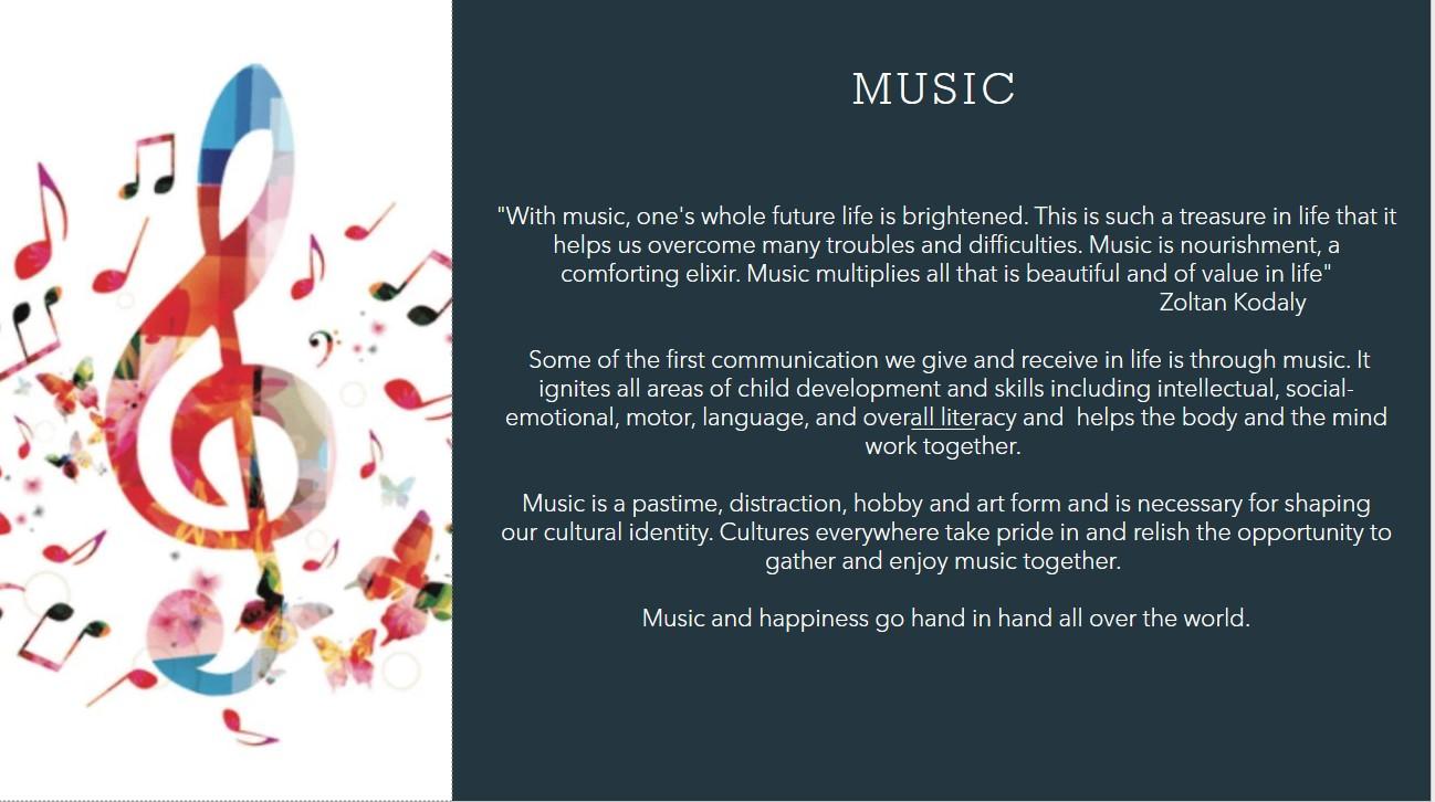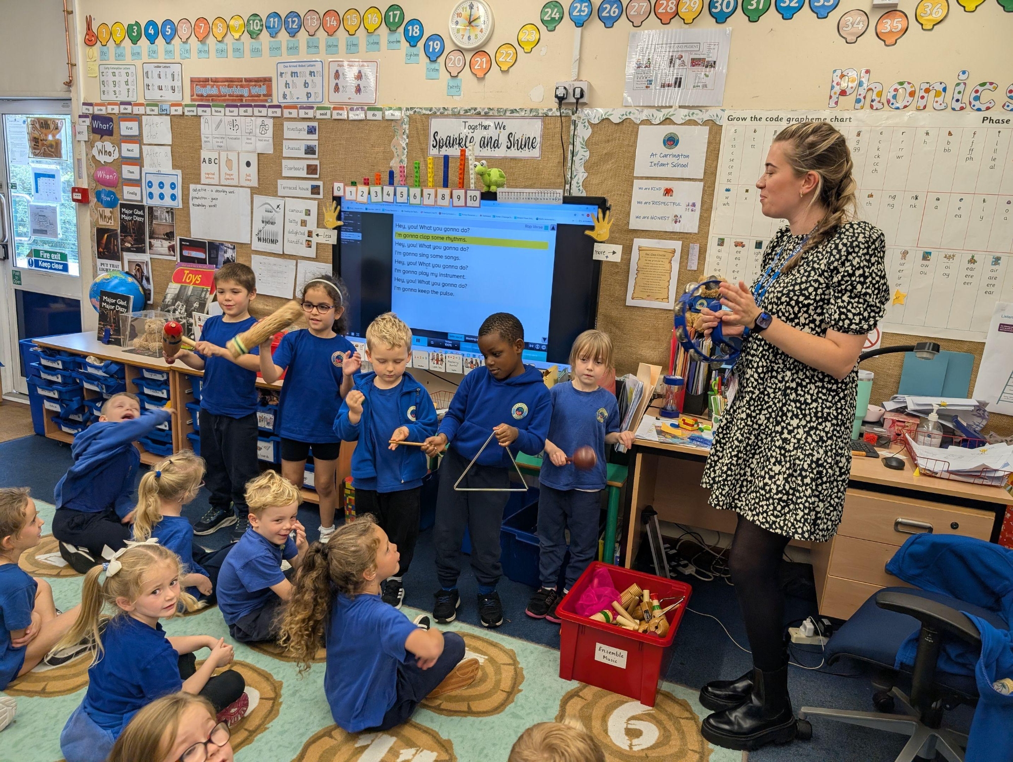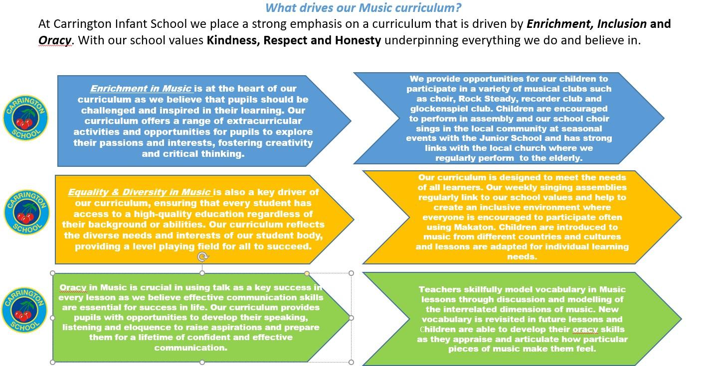 Music is a unique and powerful form of communication. It impacts the way our children here at Carrington Infant School feel, think and act. Allowing opportunities for the children to be creative, express themselves musically and perform together is an essential part of our nurturing ethos. From Early Years through to Year 2, listening and appraising different genres of music promotes children’s language development and appreciation of music from various cultures. We follow the 'Charanga' scheme, however our Carrington music curriculum goes well beyond this. Throughout the year a variety of music experiences are provided for our children, which include; Harvest festival, Easter service, instrumental workshops, choir, Rock Steady club and so much more.