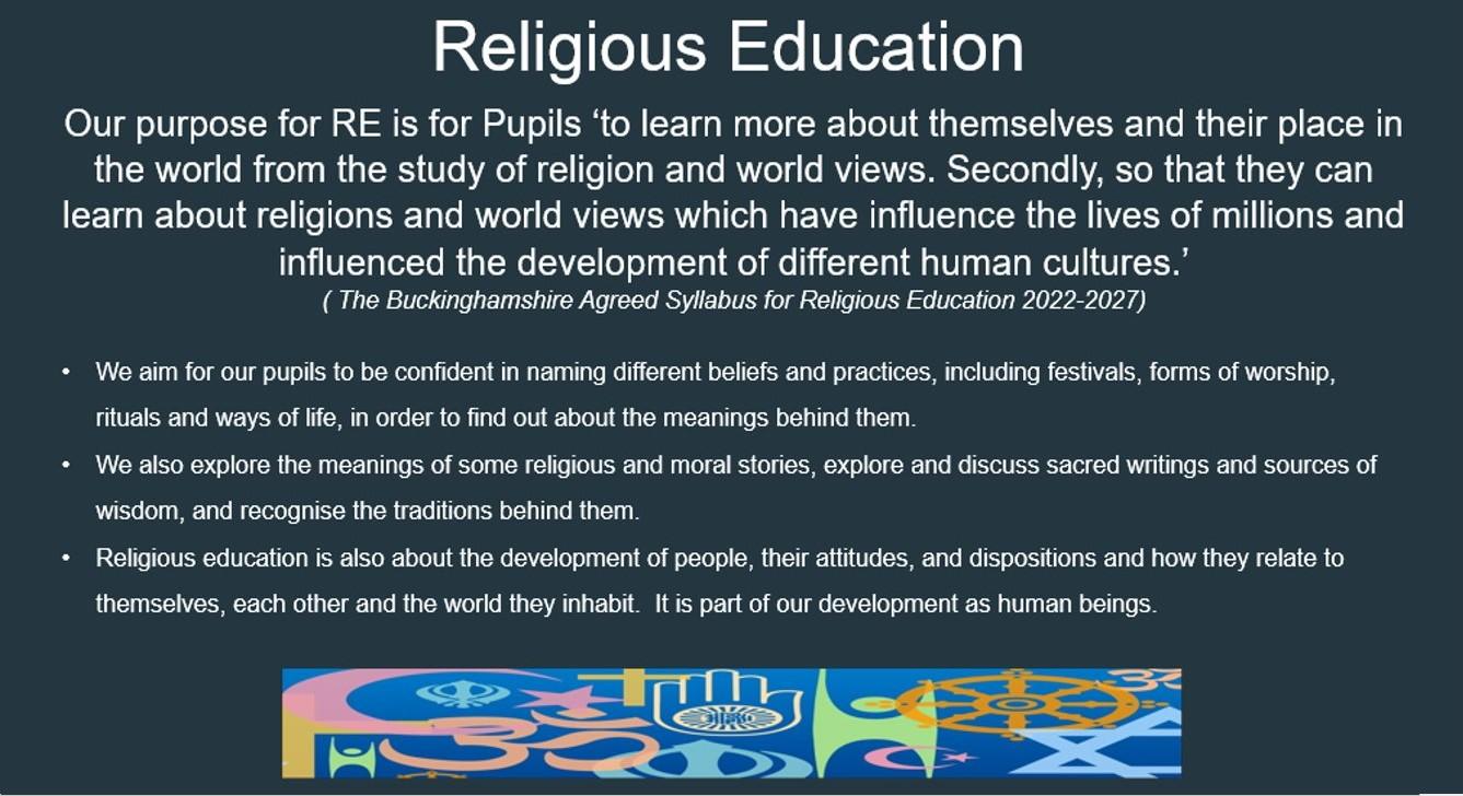 Please see below a link to Buckinghamshire Agreed Syllabus for Religious Education. Alongside this syllabus we bring children's learning alive, by having a wide variety of practical experiences and engaging activities.